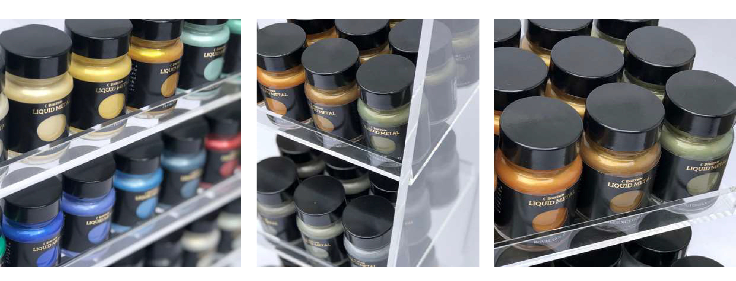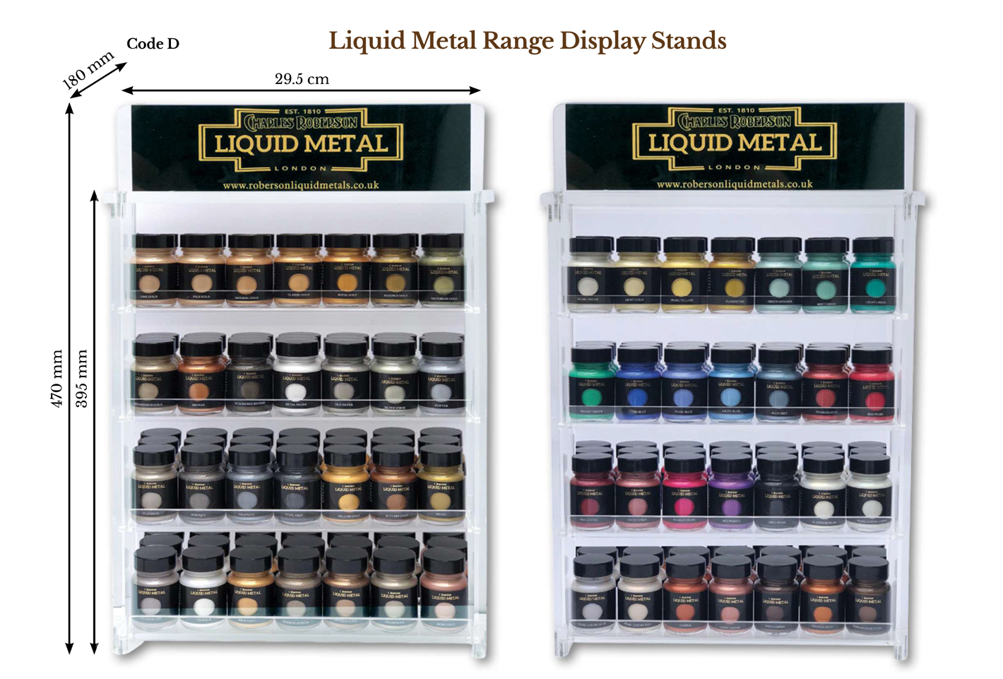 Liquid Metals are a range of 58 brilliant metallic shades. For retail customers, we supply attractive display stands for the popular 30ml pot size.